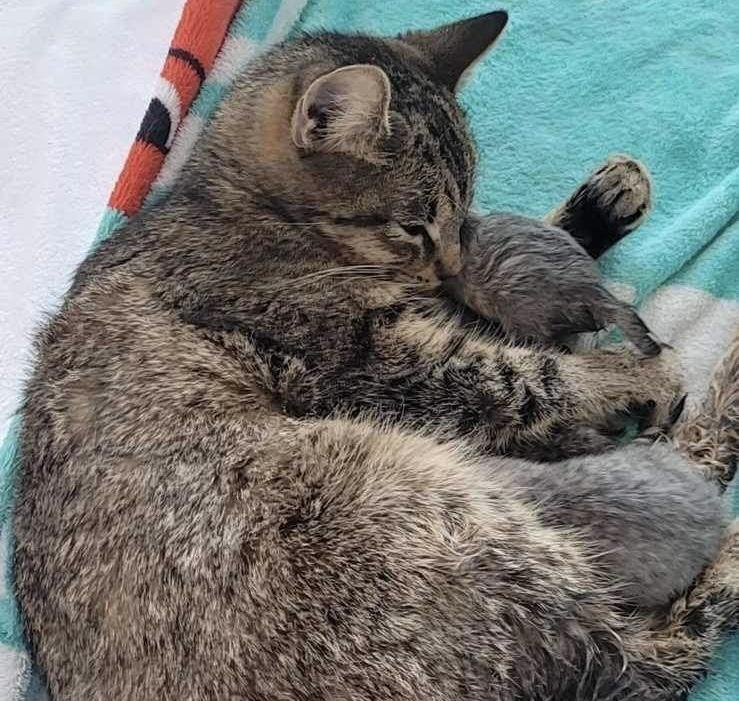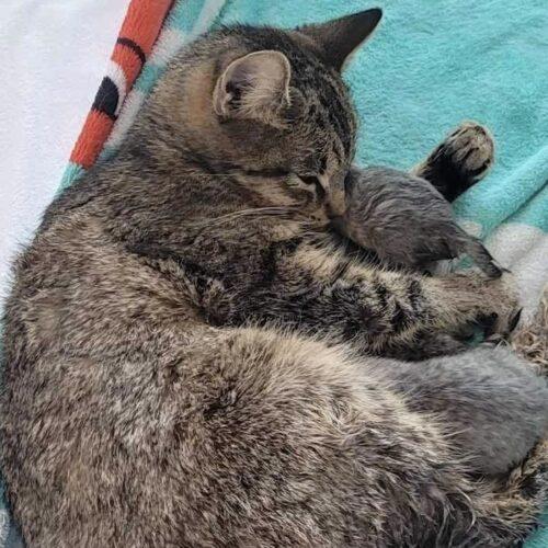 Aisling came to the Sanctuary with new born kittens. She had had a traumatic birth and her uterus prolapsed. She required immediate surgery to survive. This poor little mama had a very tough start.