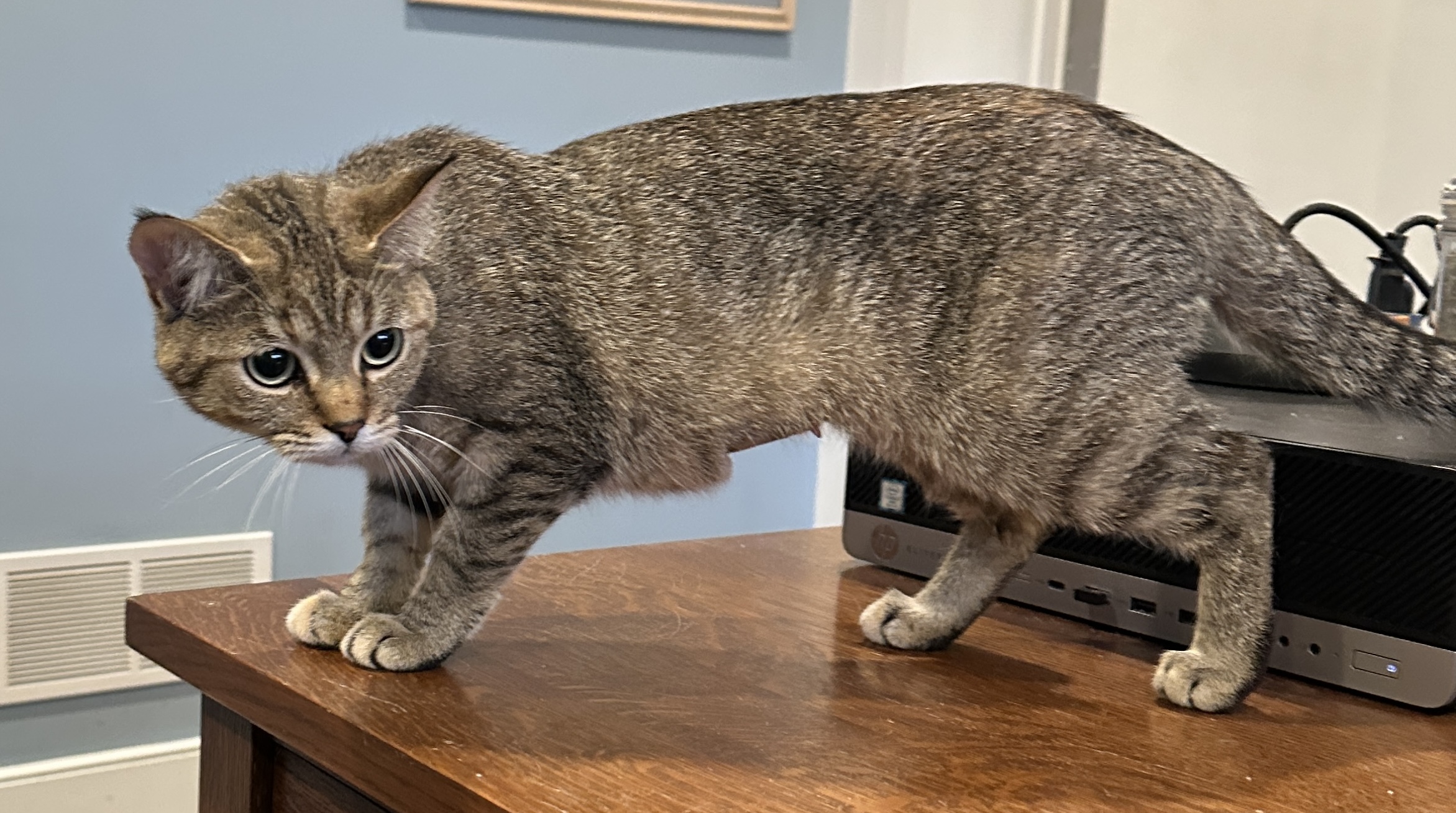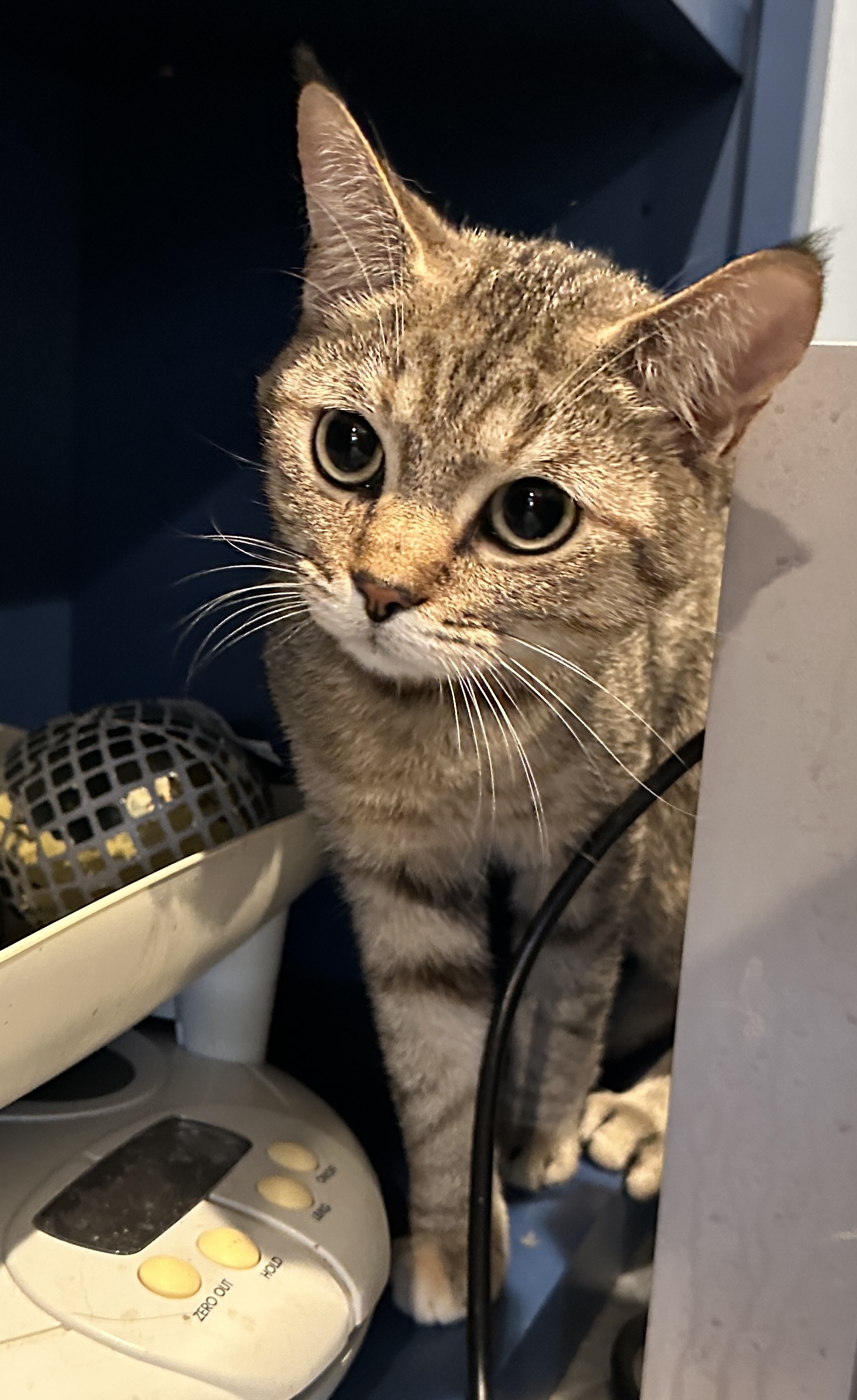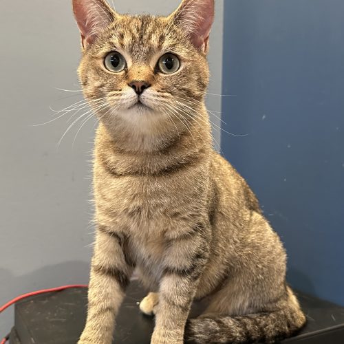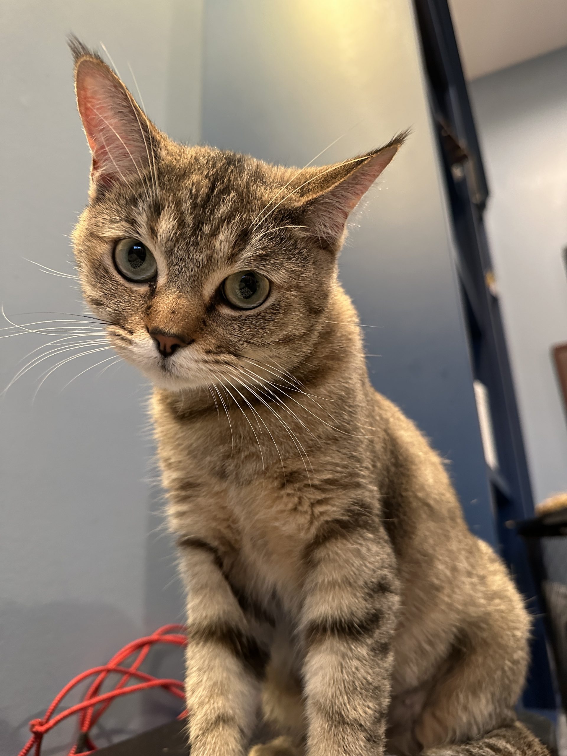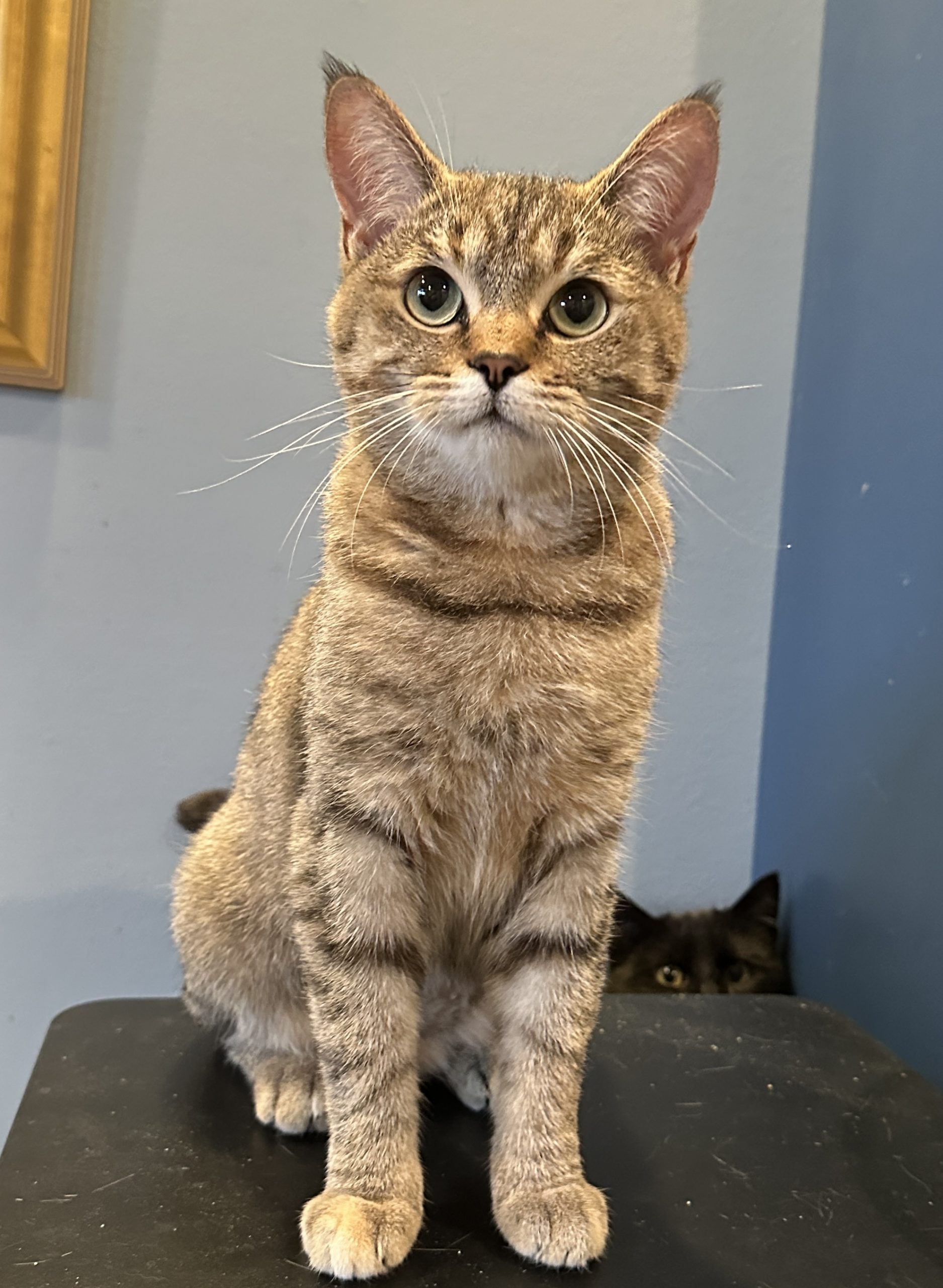 Dusty loves cuddling with Lint, but she’s not as comfortable around other cats. She will coexist with them, but if they get to close she will give them a growl and hiss as a warning to stay back. She never actually backs up her vocal threats with any physical action.
