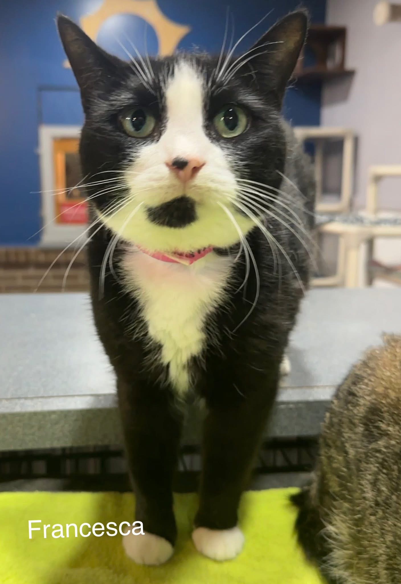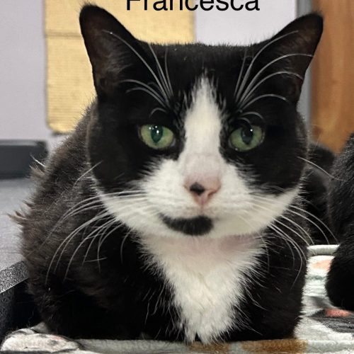 Francesca prefers a calmer atmosphere. She is a sweet snuggler and enjoys a nice lap and a cuddle. She is also fond of other cats and usually cuddles with them for naps.