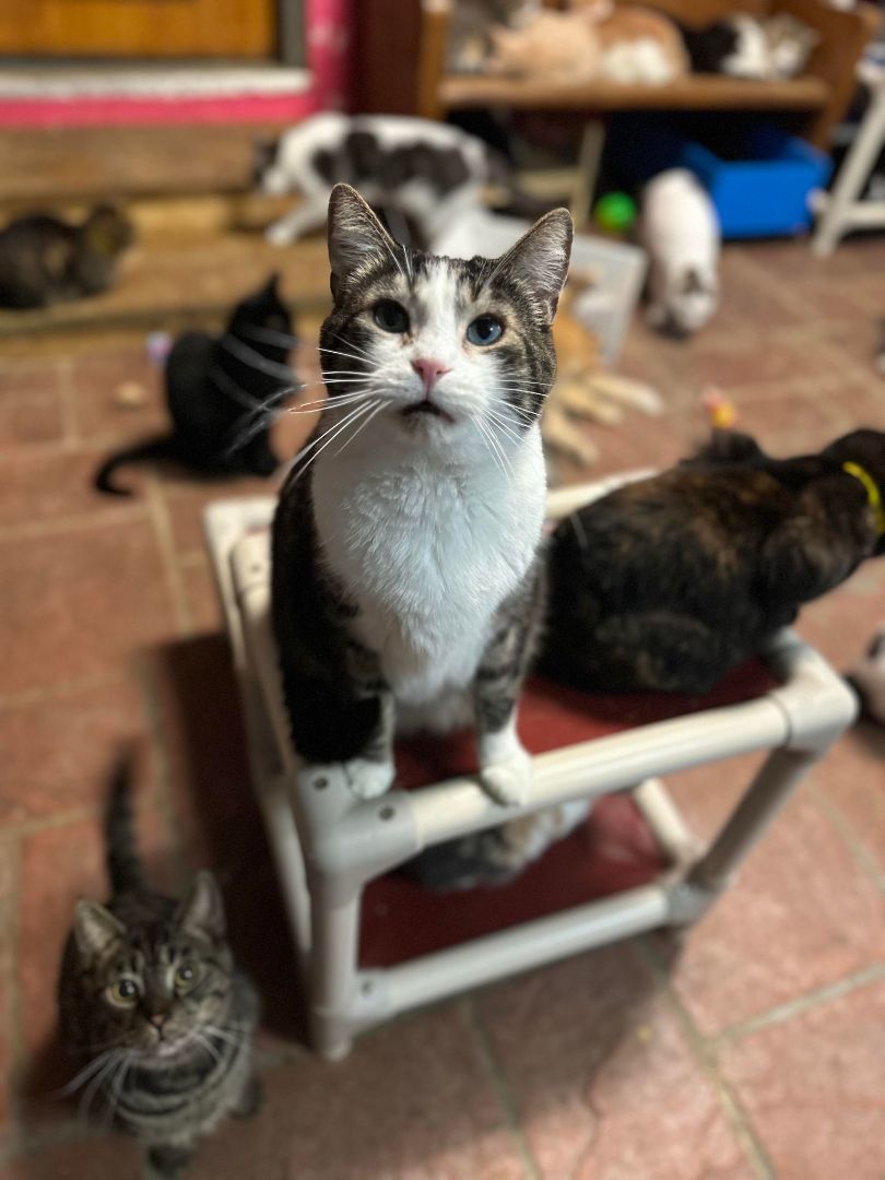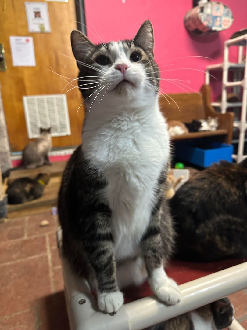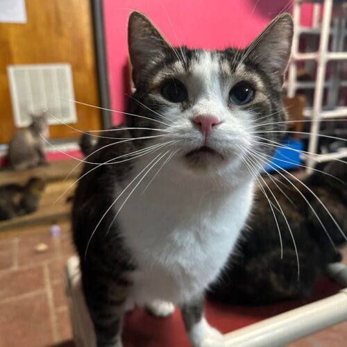 Franklin gets along great with other cats. He has not had much exposure to dogs. But he would do best with gentle, calmer creatures. Because Franklin is a bit sensitive to the energy and activity around him, he would do best in a home without small children.
