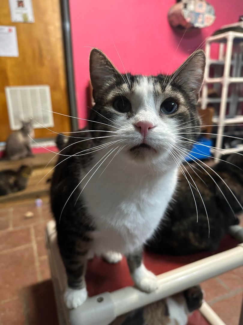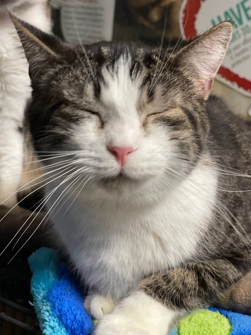 Franklin can often be found in the center of the adoption floor napping on whatever surface is handy. He is very sensitive to what is going on in the room, and if there is a lot of commotion, he will go into the corners to be left alone. But if you make an appointment to come in at a time, that’s not so busy, you will encounter a more relaxed and happier Franklin.
