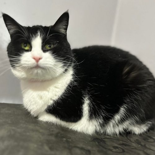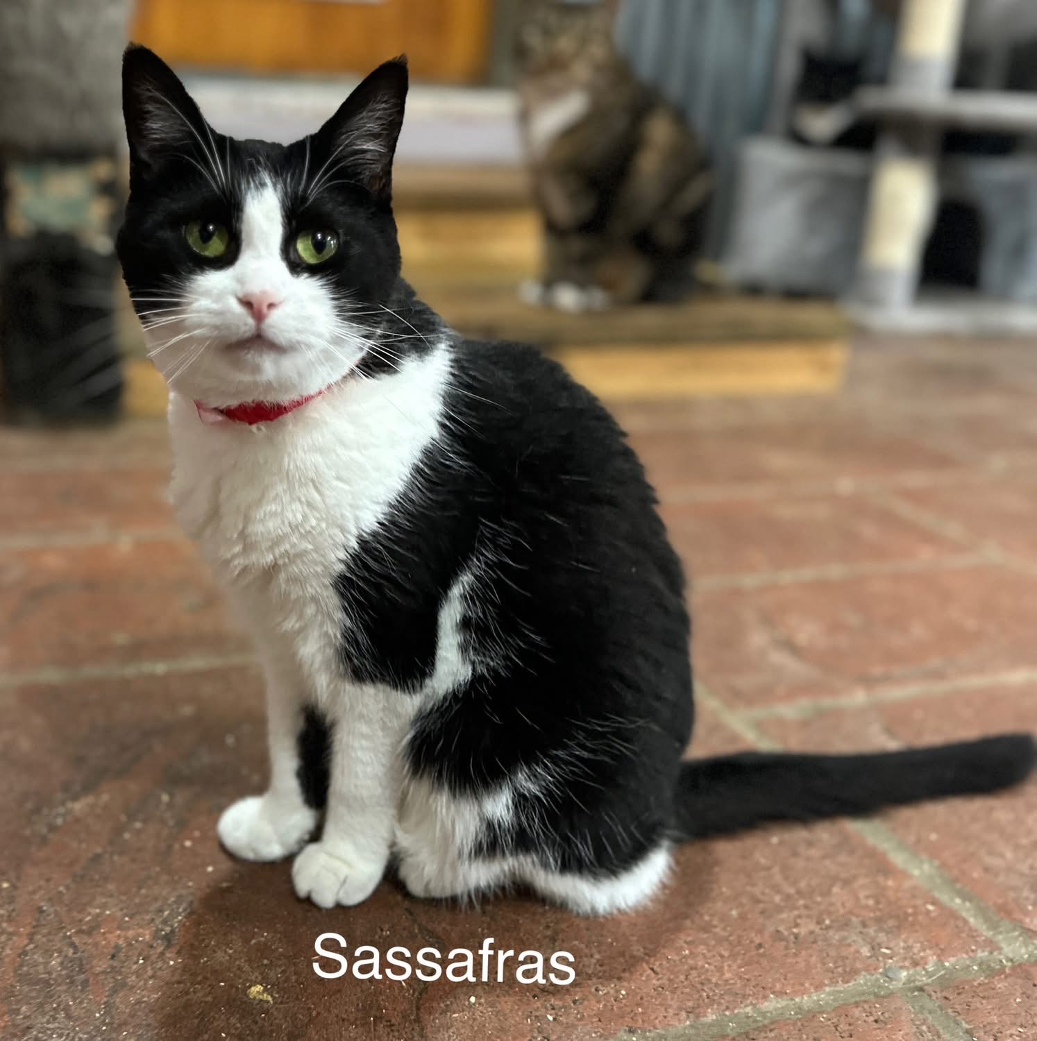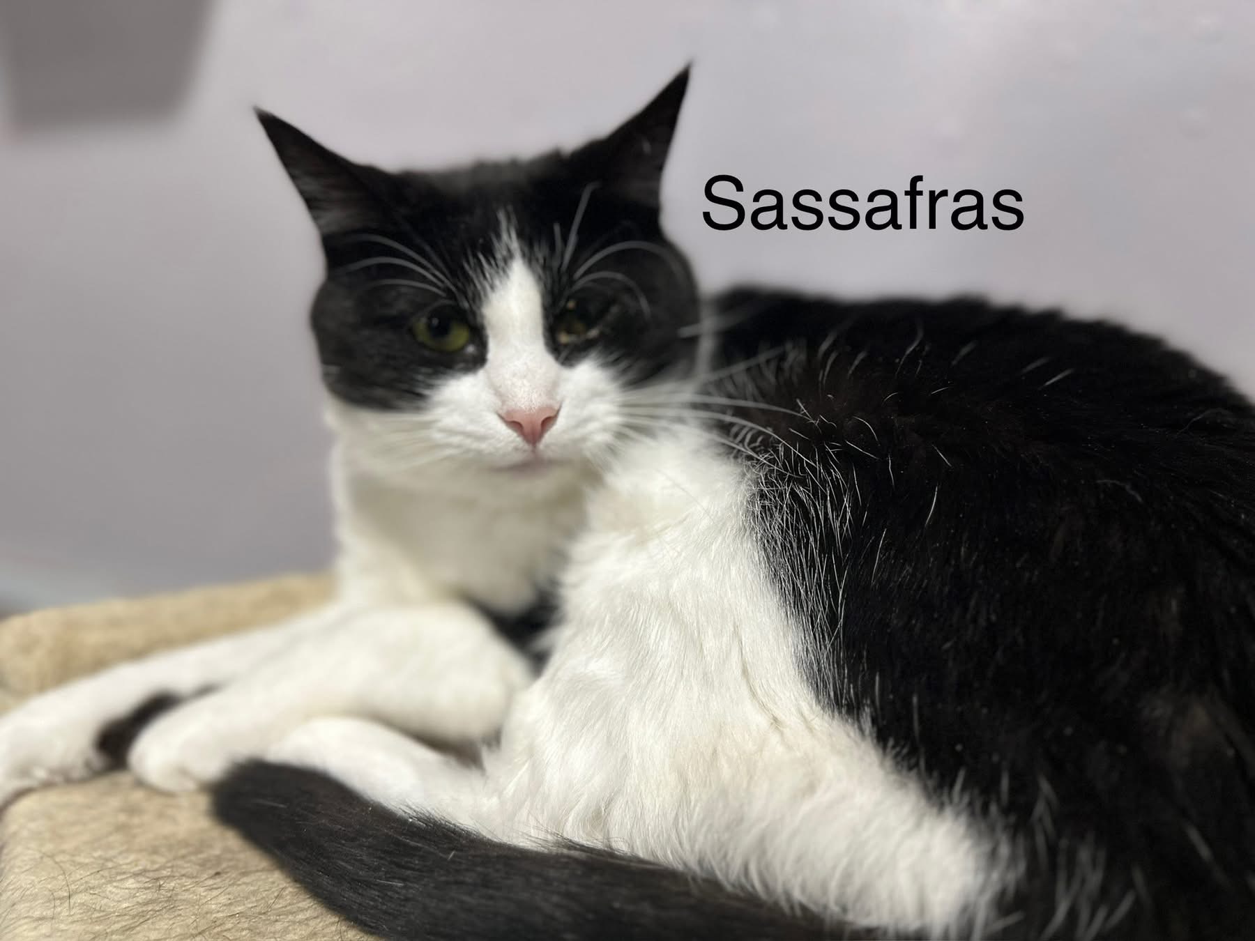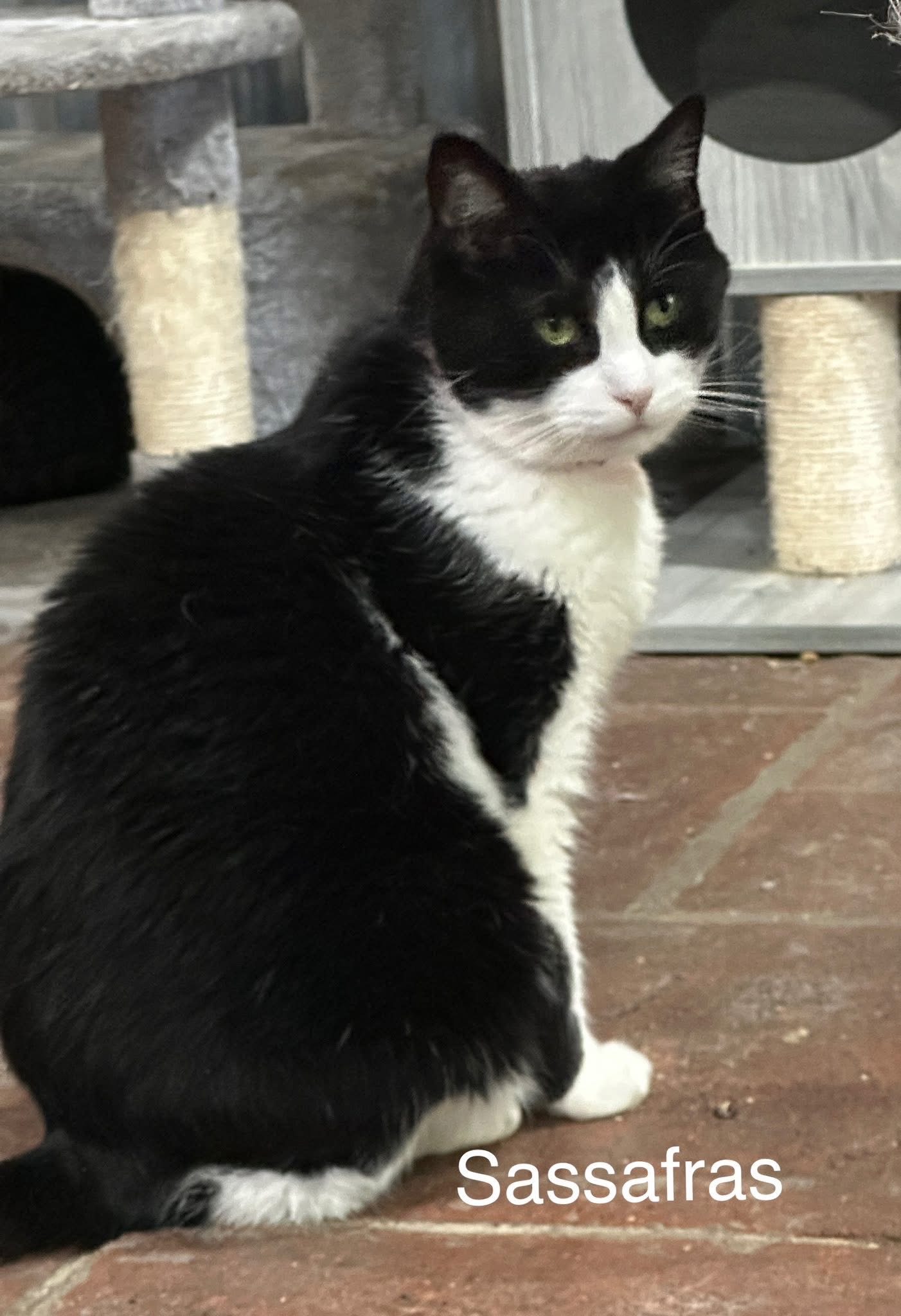 Sassafras prefers a quiet space to take in her surroundings. She’s not one to seek out your affections, but will take it if you slowly approach her. Sassafrass can be very sweet and endearing once she is familiar with you.   She has begun to present herself to more people for cuddles and scratches lately.