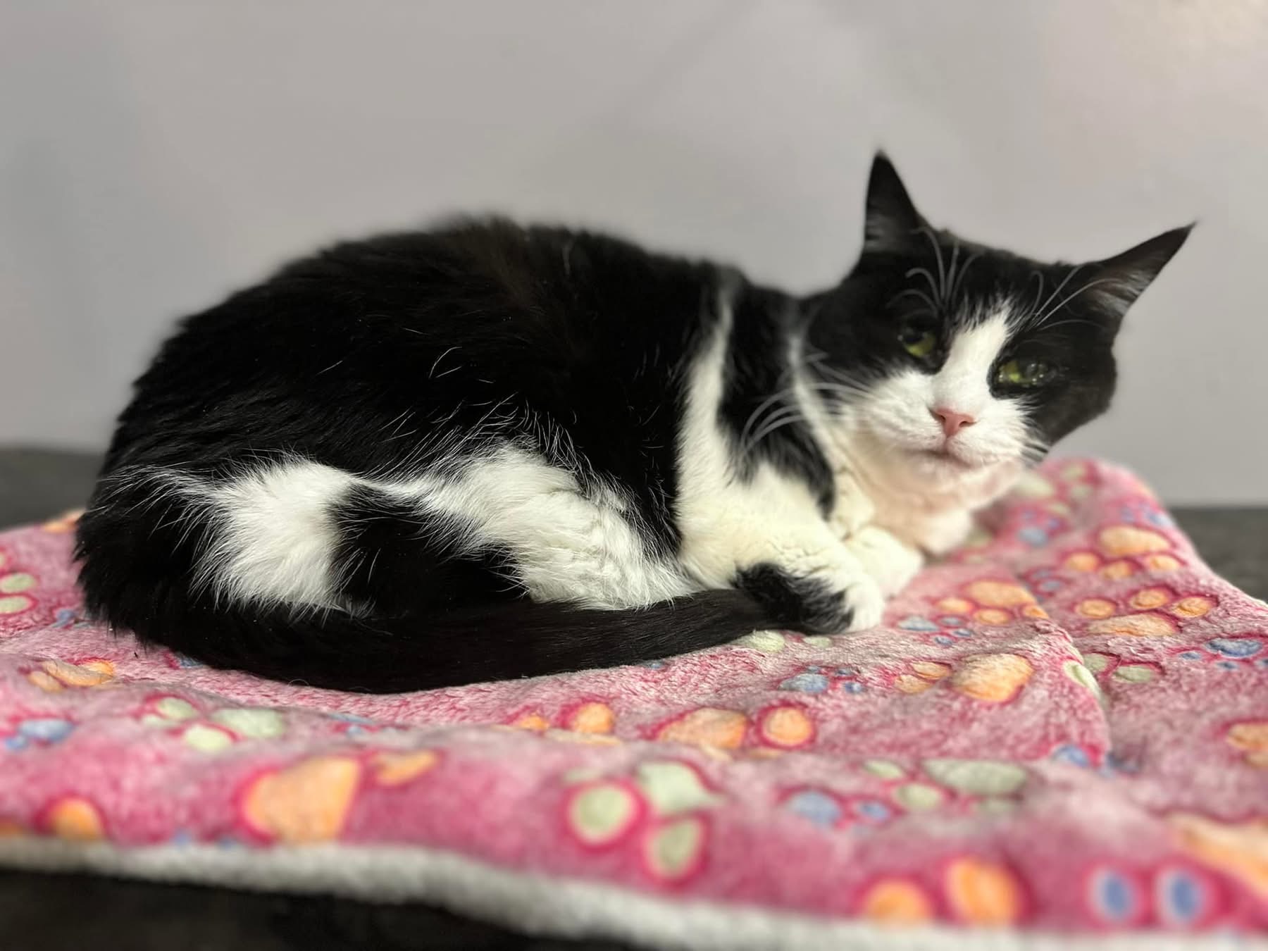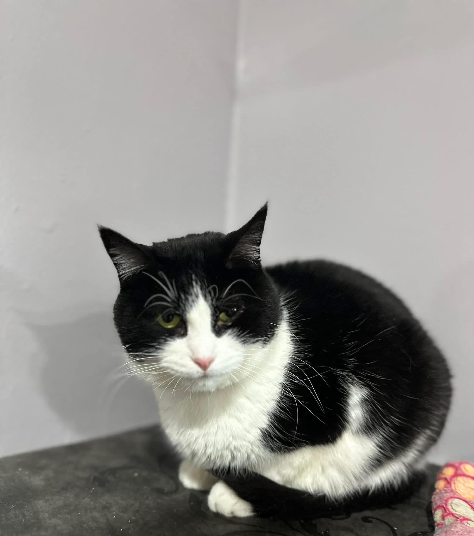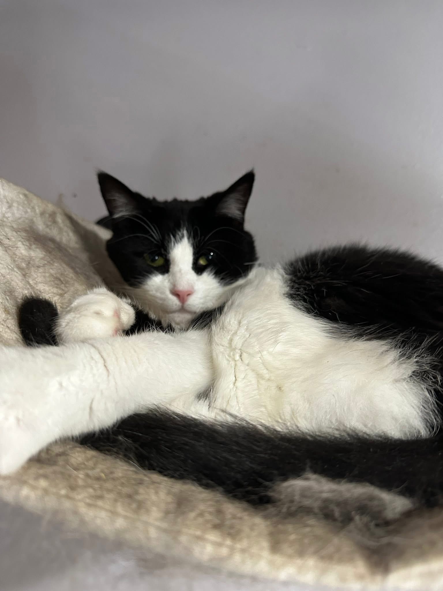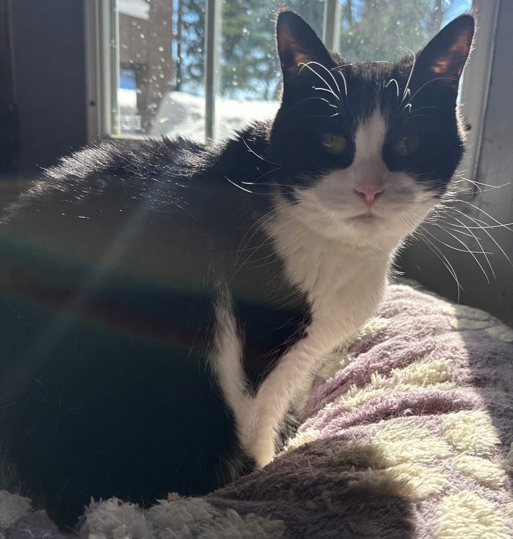 Sassafras prefers a quiet space to take in her surroundings. She’s not one to seek out your affections, but will take it if you slowly approach her. Sassafrass can be very sweet and endearing once she is familiar with you.   She has begun to present herself to more people for cuddles and scratches lately.