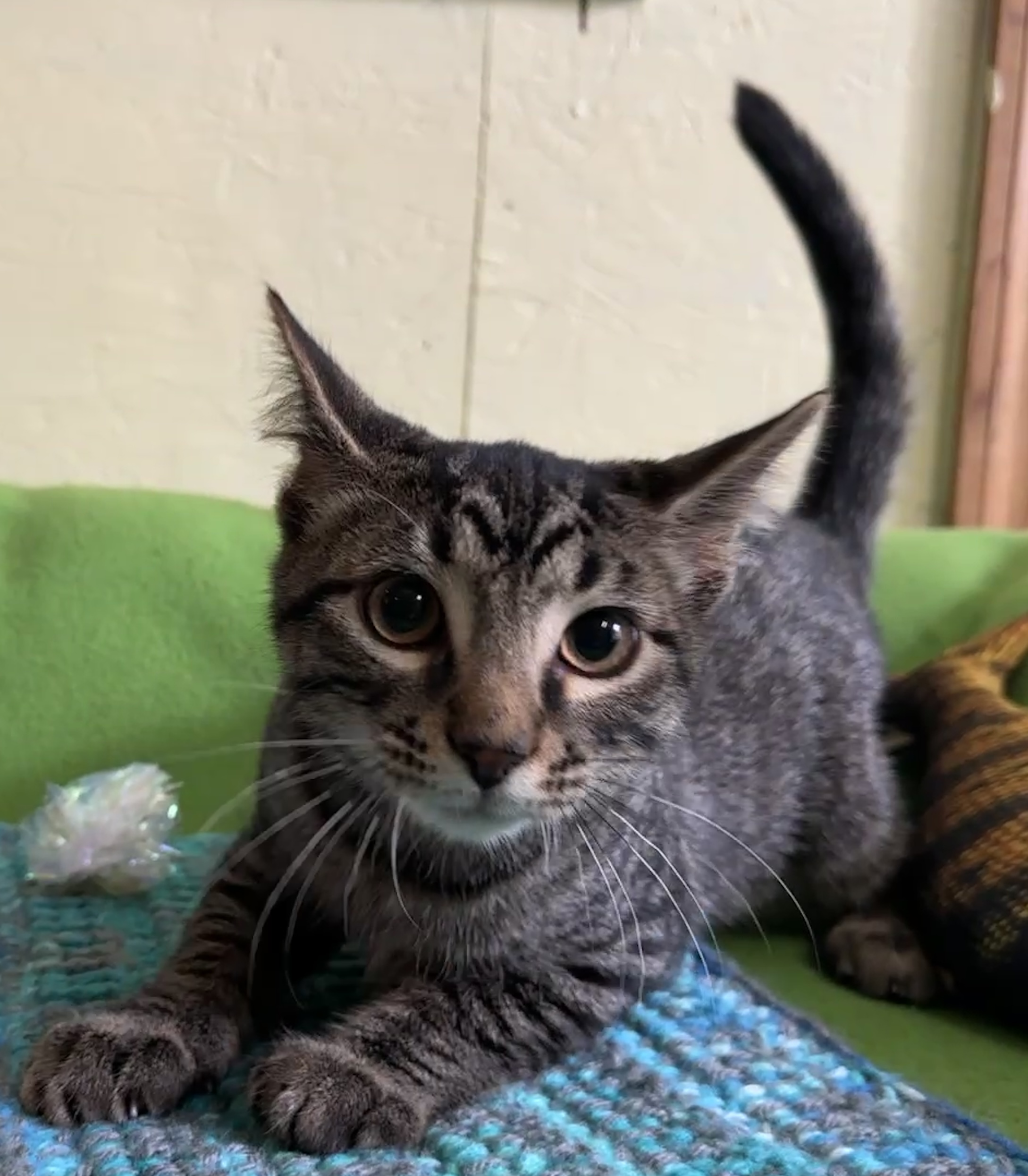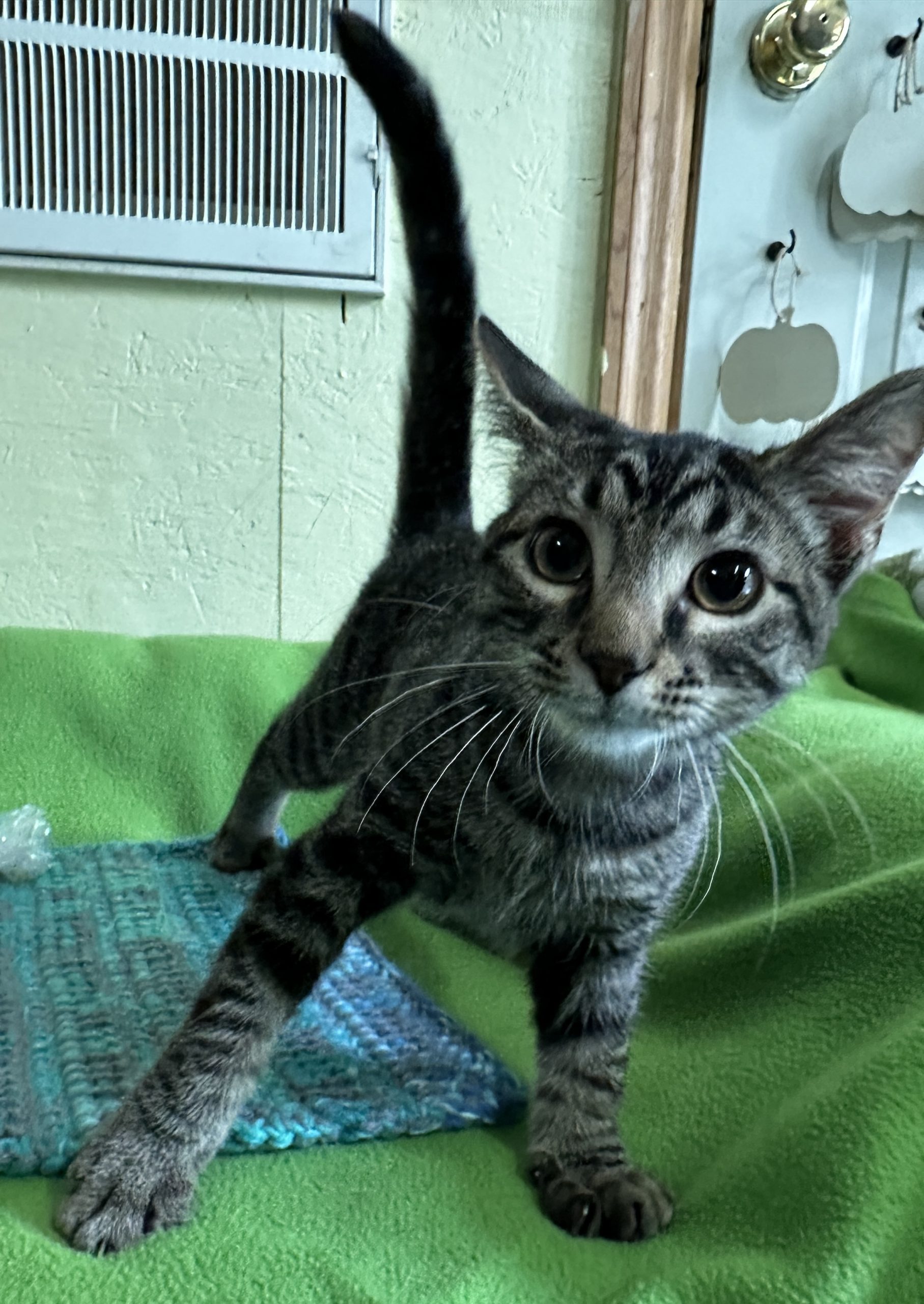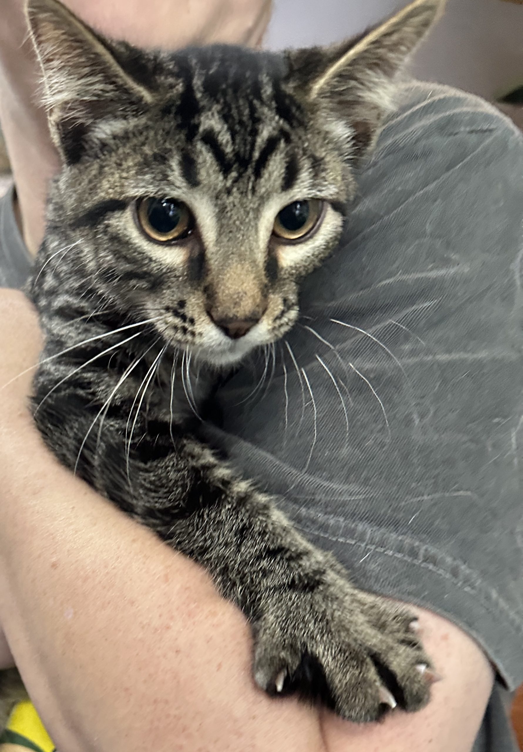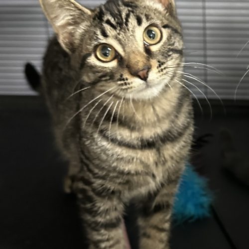 Scallion’s pelvis and back legs were injured in his encounter with the dogs. Our veterinarian’s placed him on cage rest for a few weeks. Even when he was recovering, he and his sisters were trying to play with each other. After about 3 weeks of rest he began to bear weight on his back legs again. He has recovered from his injuries, but still has a wide stance to his back legs. He has a bit of a bowed-legged look, but is able to run and jump just fine. He is an adorable cuddly curious neutered tabby male. He likes to play and run but also displays a bit more calmness than his sisters.