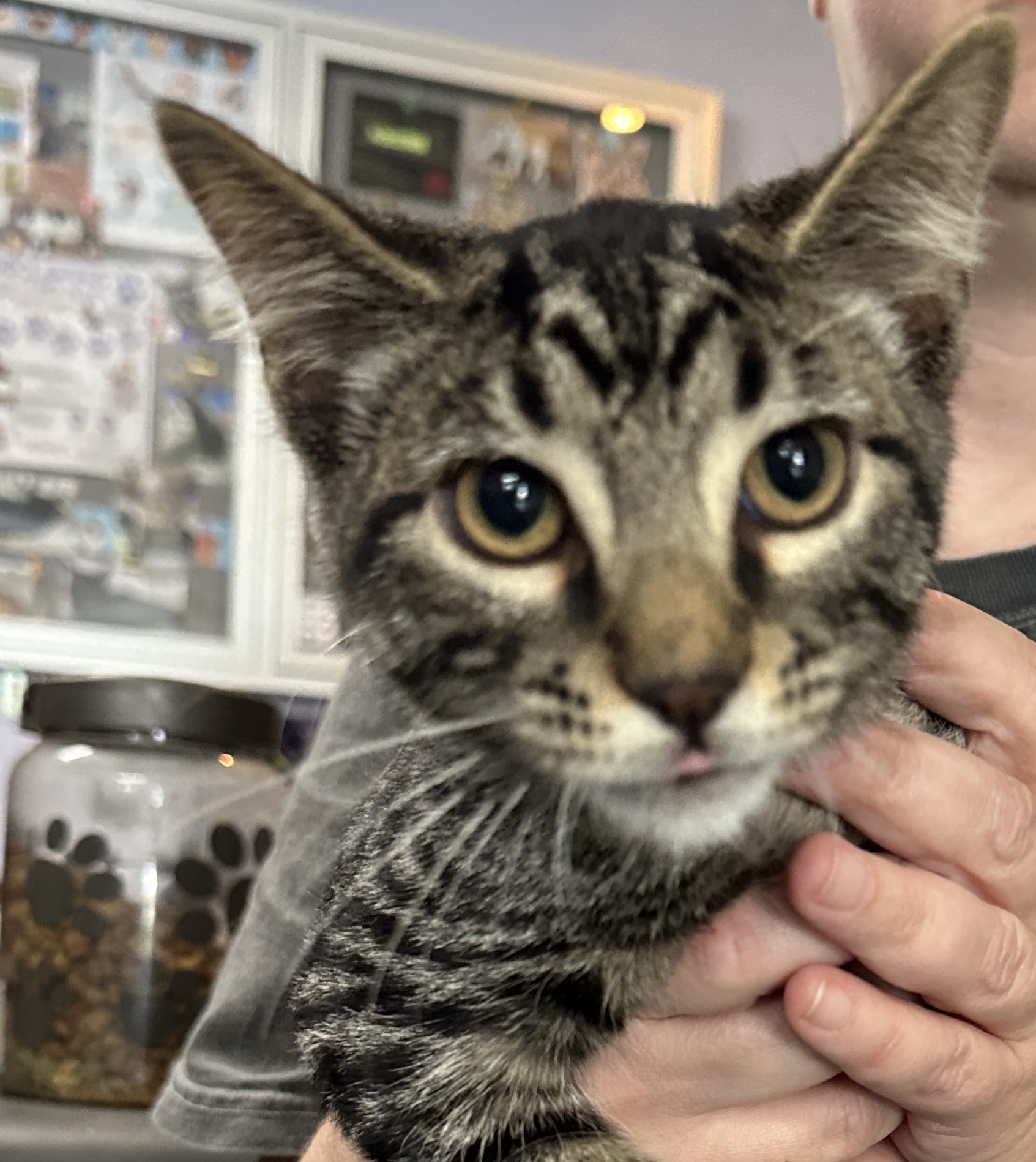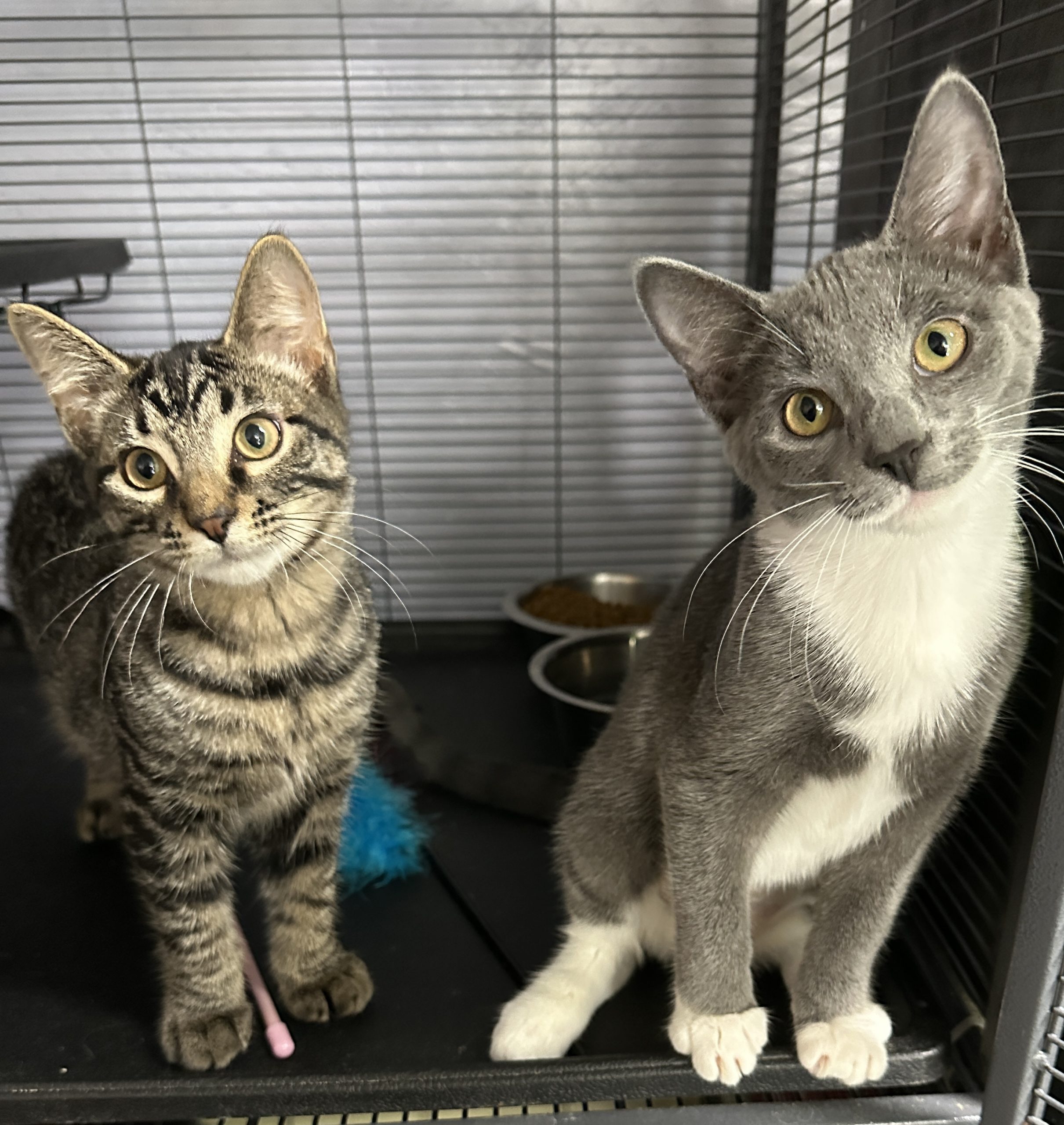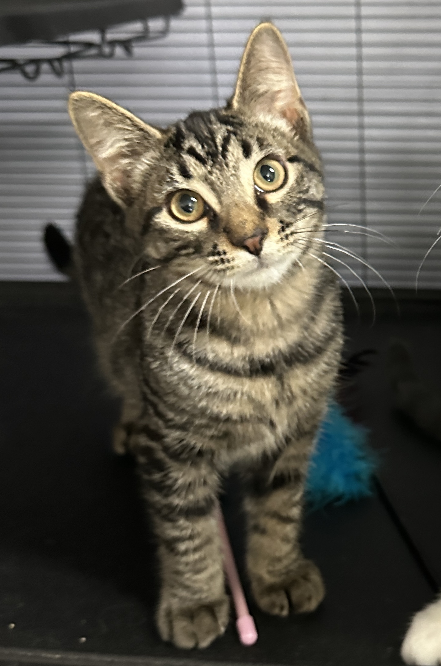 Scallion’s pelvis and back legs were injured in his encounter with the dogs. Our veterinarian’s placed him on cage rest for a few weeks. Even when he was recovering, he and his sisters were trying to play with each other. After about 3 weeks of rest he began to bear weight on his back legs again. He has recovered from his injuries, but still has a wide stance to his back legs. He has a bit of a bowed-legged look, but is able to run and jump just fine. He is an adorable cuddly curious neutered tabby male. He likes to play and run but also displays a bit more calmness than his sisters.