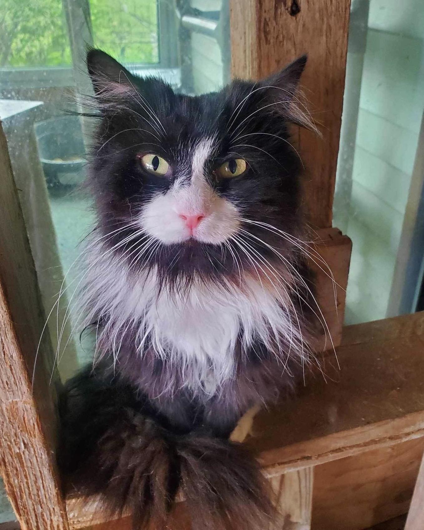 This dapper little girl arrived at the Sanctuary in June of 2022. She was terrified of people. She came from a colony with her daughters and granddaughters. The males in the colony aggressively fought for mating rights with the females and poor Victrola was stuck in a cycle of continuous pregnancies.